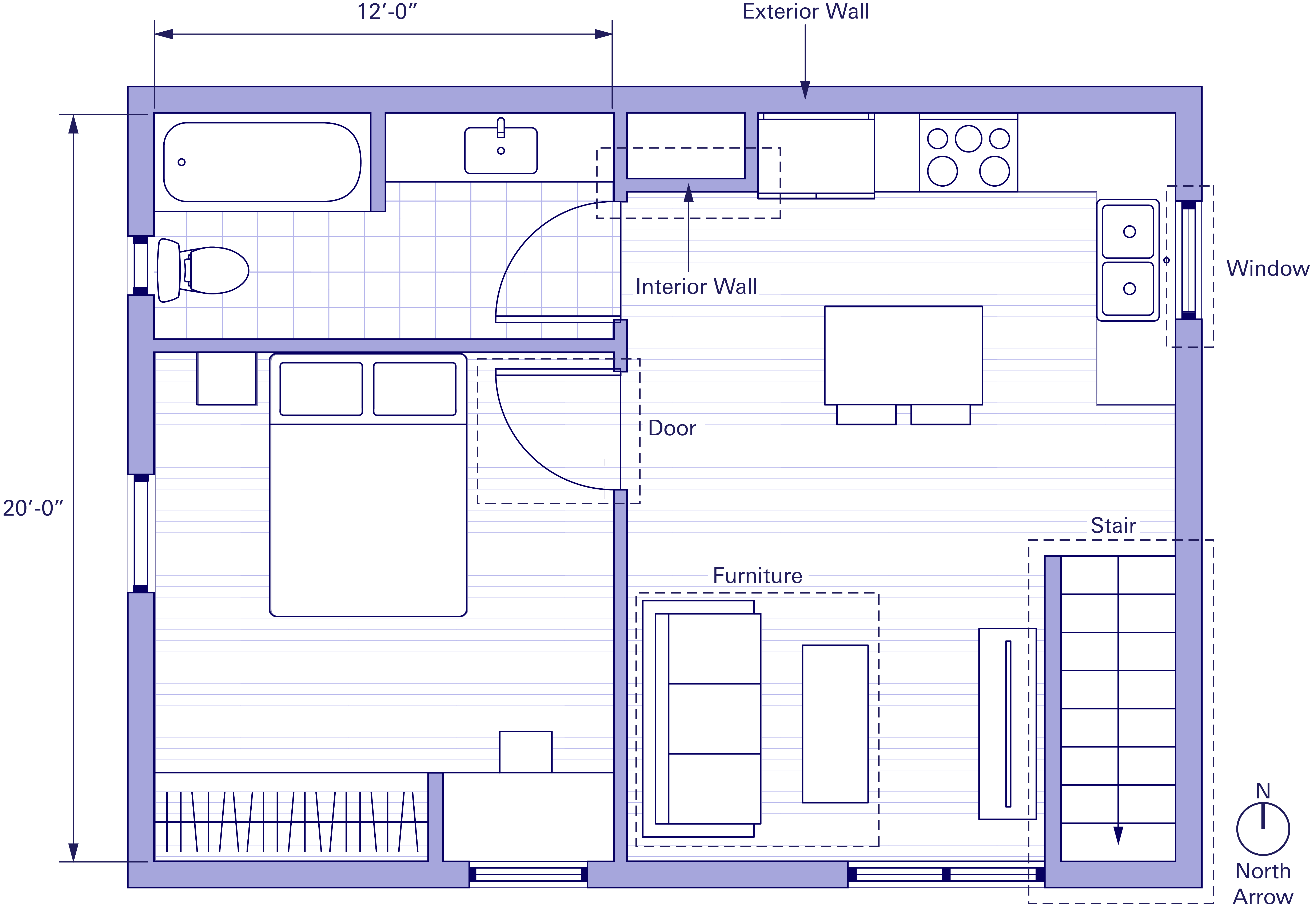An architectural floor plan is a drawing that presents an aerial view of an interior space and how the spaces are arranged within and around a building at a specific level. For your ADU, that means the floor plan is a top-down view if you cut a slice through your home at around waist height. Plan drawings visually communicate important information about a space’s layout. Understanding some of these elements can help you communicate with your selected RDP and construction contractor, so you can make informed decisions about your ADU design. The diagram below highlights some key components of an architectural floor plan drawing. |